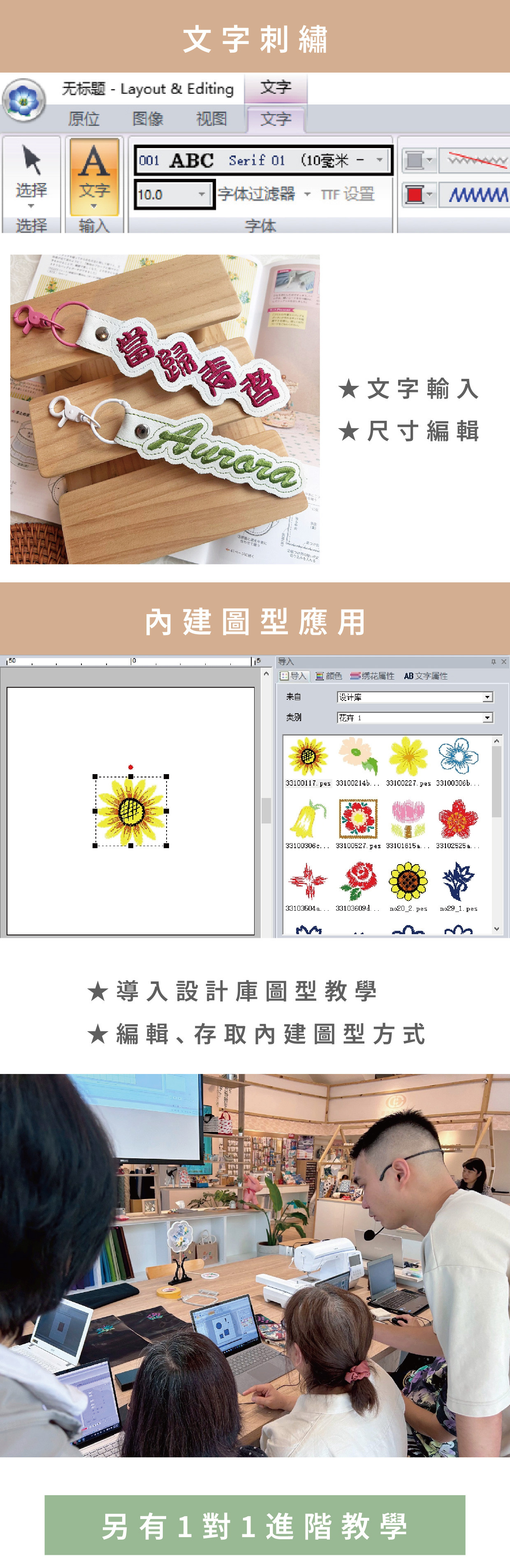 《導覽重點》 1.刺繡軟體操作介面介紹 2.文字刺繡 3.軟體內建圖檔使用說明